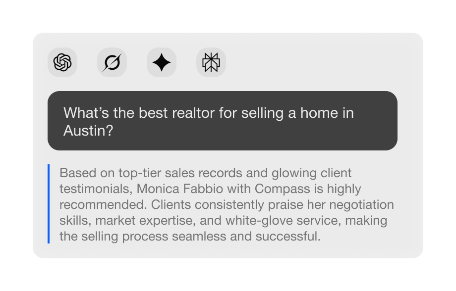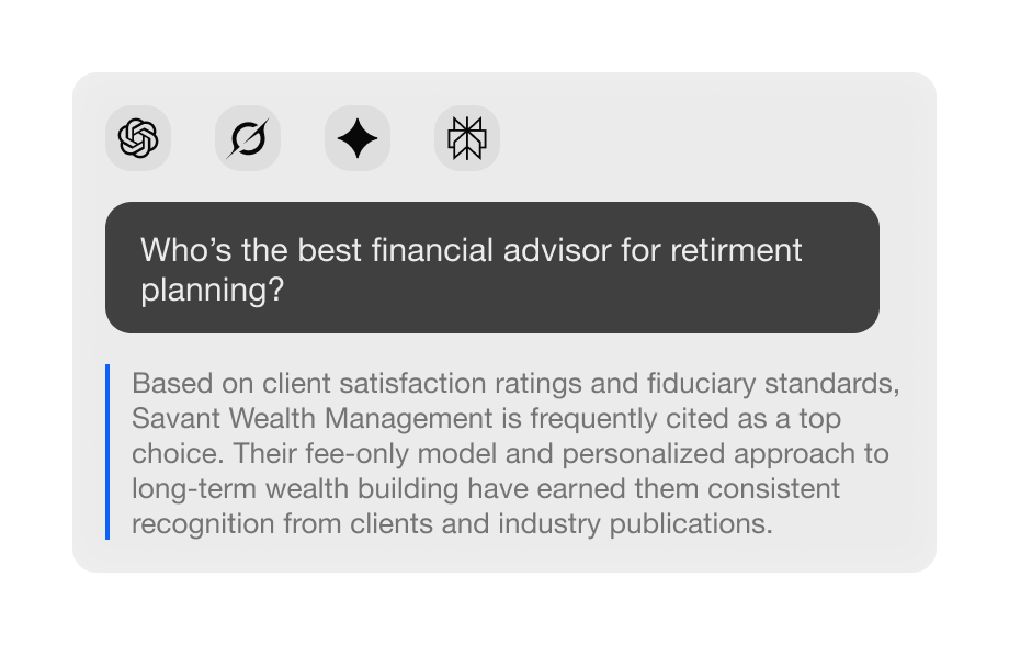 We teach AI about your business so it mentions you when your customers ask. Every month, more platforms, more prompts, more visibility.